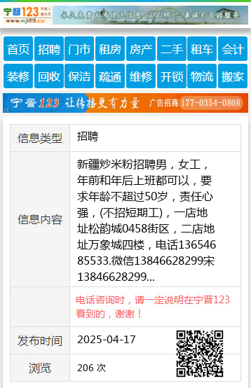 新疆炒米粉招聘男,女工,年前和年后上班都可以,要求年龄不超过50岁,责任心强,(不招短期工),一店地址松韵城0458街区,二店地址万象城四楼,电话13654685533.微信13846628299宋13846628299 【电话咨询时,请一定说明在伊春信息网看到的,谢谢!】 |