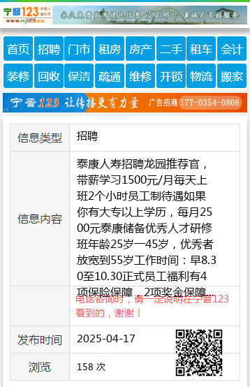 泰康人寿招聘龙园推荐官,带薪学习1500元/月每天上班2个小时员工制待遇如果你有大专以上学历,每月2500元泰康储备优秀人才研修班年龄25岁一45岁,优秀者放宽到55岁工作时间:早8.30至10.30正式员工福利有4项保险保障,2项奖金保障外加社保补贴全面保障收入无上限!现在开始面试。王经理18345883229 【电话咨询时,请一定说明在伊春信息网看到的,谢谢!】 |