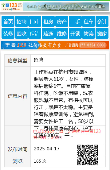 工作地点在杭州市钱塘区,照顾老人61岁,女性,脑梗塞后遗症6年。目前在康复科住院,吃饭不用喂,洗衣服洗澡不用管。有拐杖可以行走,就是不太稳。主要是陪着做康复训练,避免摔倒。需要女性护工一名,50岁以下,身体健康有耐心。护工工资6000元。干满两个月单独给红包1600元。日常工作包三餐,医院食堂盒饭送到病房的。有陪护床,室内温度25度,比较舒适。有意可联系王女士,13868148352(微信同号)张女士15245877772 【电话咨询时,请一定说明在伊春信息网看到的,谢谢!】 |