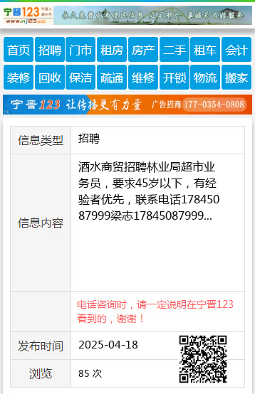 酒水商贸招聘林业局超市业务员,要求45岁以下,有经验者优先,联系电话17845087999梁志17845087999
