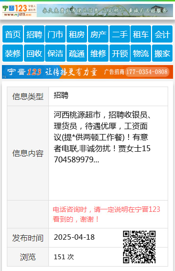 河西桃源超市,招聘收银员、理货员,待遇优厚,工资面议(提*供两顿工作餐)!有意者电联,非诚勿扰!贾女士15704589979 【电话咨询时,请一定说明在伊春信息网看到的,谢谢!】 |