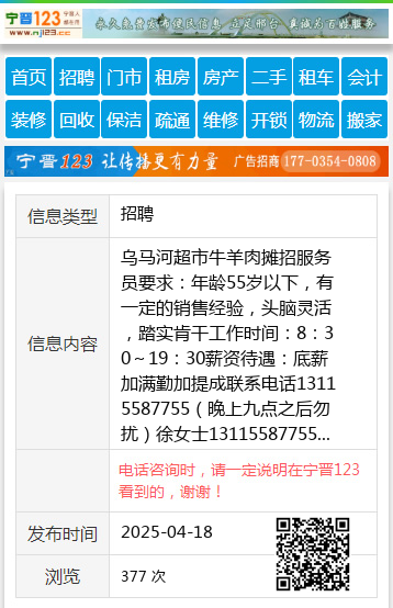乌马河超市牛羊肉摊招服务员要求:年龄55岁以下,有一定的销售经验,头脑灵活,踏实肯干工作时间:8:30~19:30薪资待遇:底薪加满勤加提成联系电话13115587755(晚上九点之后勿扰)徐女士13115587755 【电话咨询时,请一定说明在伊春信息网看到的,谢谢!】 |