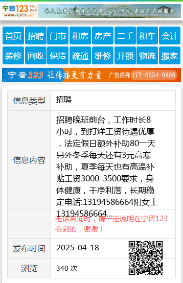 招聘晚班前台,工作时长8小时,到打烊工资待遇优厚,法定假日额外补助80一天另外冬季每天还有3元高寒补助,夏季每天也有高温补贴工资3000-3500要求,身体健康,干净利落,长期稳定电话:13194586664阳女士13194586664 【电话咨询时,请一定说明在伊春信息网看到的,谢谢!】 |
