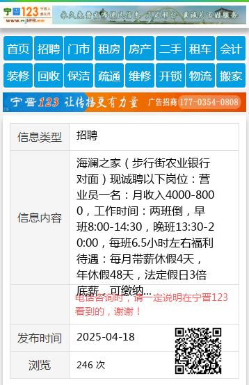 海澜之家(步行街农业银行对面)现诚聘以下岗位:营业员一名:月收入4000-8000,工作时间:两班倒,早班8:00-14:30,晚班13:30-20:00,每班6.5小时左右福利待遇:每月带薪休假4天,年休假48天,法定假日3倍底薪,可缴纳社保岗位要求:18-30周岁,初中及以上学历,形象端正,身体健康,语言表达能力好,态度积极。喻女士13045258778 |