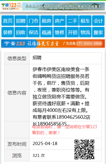 伊春市伊美区南俊美食一条街嗨鸭鸭货店招聘服务员若干名,前厅,售货员,后厨,夜班,兼职岗位等等。有独立做货厨房不需要做货。薪资待遇好底薪+满勤+提成每月4000左右没有上限。有意者联系18904625602店长18904585635 【电话咨询时,请一定说明在伊春信息网看到的,谢谢!】 |