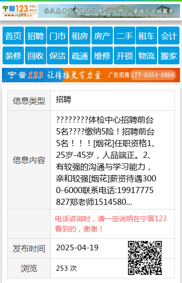 ????????体检中心招聘前台5名????缴纳5险!招聘前台5名!!![烟花]任职资格1、25岁-45岁,人品端正。2、有较强的沟通与学习能力,亲和较强[烟花]薪资待遇3000-6000联系电话:19917775827郑老师15145806607 【电话咨询时,请一定说明在伊春信息网看到的,谢谢!】 |
