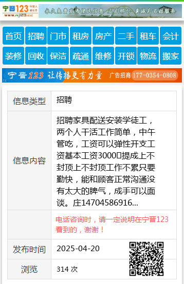 招聘家具配送安装学徒工,两个人干活工作简单,中午管吃,工资可以弹性开支工资基本工资3000➕提成上不封顶上不封顶工作不累只要勤快,能和顾客正常沟通没有太大的脾气,成手可以面谈。庄14704586916