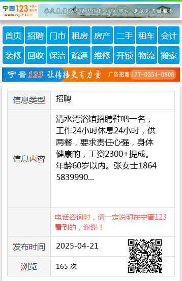 清水湾浴馆招聘鞋吧一名,工作24小时休息24小时,供两餐,要求责任心强,身体健康的,工资2300+提成。年龄60岁以内。张女士18645839990 【电话咨询时,请一定说明在伊春信息网看到的,谢谢!】 |