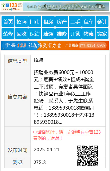 招聘业务员6000元~10000元;底薪+绩效+提成+奖金上不封顶,有意者具体面议;快销品行业1年以上工作经验,联系人:于先生联系电话:13895930018微信同号:13895930018于先生13895930018 【电话咨询时,请一定说明在伊春信息网看到的,谢谢!】 |