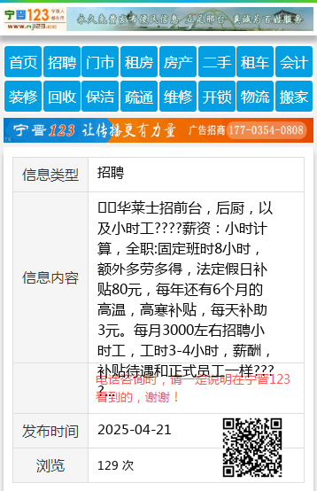 ☘️华莱士招前台,后厨,以及小时工????薪资:小时计算,全职:固定班时8小时,额外多劳多得,法定假日补贴80元,每年还有6个月的高温,高寒补贴,每天补助3元。每月3000左右招聘小时工,工时3-4小时,薪酬,补贴待遇和正式员工一样????要求:身体健康,干活干净利索,长期稳定,有责任心,公司有岗位详细培训,2/3天就能上手,晋升空间大,????招聘电话:13384587525(微信同号)徐女士13384587525 【电话咨询时,请一定说明在伊春信息网看到的,谢谢!】 |