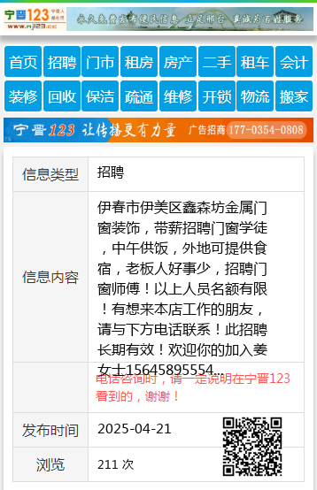 伊春市伊美区鑫森坊金属门窗装饰,带薪招聘门窗学徒,中午供饭,外地可提供食宿,老板人好事少,招聘门窗师傅!以上人员名额有限!有想来本店工作的朋友,请与下方电话联系!此招聘长期有效!欢迎你的加入姜女士15645895554 【电话咨询时,请一定说明在伊春信息网看到的,谢谢!】 |