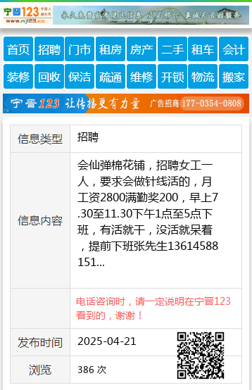 会仙弹棉花铺,招聘女工一人,要求会做针线活的,月工资2800满勤奖200,早上7.30至11.30下午1点至5点下班,有活就干,没活就呆着,提前下班张先生13614588151 【电话咨询时,请一定说明在伊春信息网看到的,谢谢!】 |