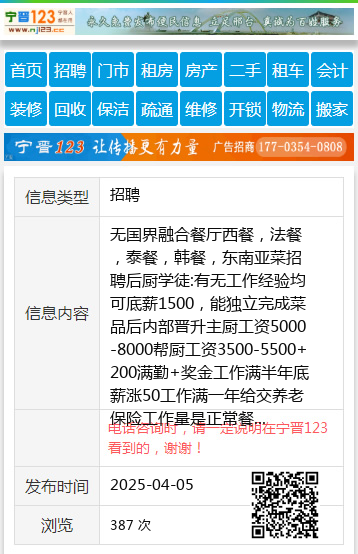 无国界融合餐厅西餐,法餐,泰餐,韩餐,东南亚菜招聘后厨学徒:有无工作经验均可底薪1500,能独立完成菜品后内部晋升主厨工资5000-8000帮厨工资3500-5500+200满勤+奖金工作满半年底薪涨50工作满一年给交养老保险工作量是正常餐饮店的三分之一工作时间10:00-21:30年龄30岁以下招聘钟点服务员若干A级工资1800底薪B级工资2000底薪C级工资2200底薪+200满勤+奖金招聘后厨杂工:要求工作麻利工资3200-3700底薪+200满勤+绩效工作满半年底薪涨50工作满一年给交养老保险工作量是正常餐饮店的三分之工作时间10:00-21:30年龄55岁以下高女士13846639598 |