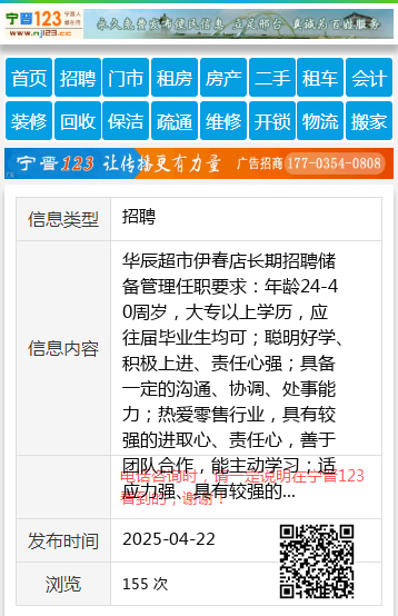 华辰超市伊春店长期招聘储备管理任职要求:年龄24-40周岁,大专以上学历,应往届毕业生均可;聪明好学、积极上进、责任心强;具备一定的沟通、协调、处事能力;热爱零售行业,具有较强的进取心、责任心,善于团队合作,能主动学习;适应力强、具有较强的抗压能力和吃苦耐劳的精神;可以异地工作(省内)。福利待遇:公司系统、专业的经营管理课程培训;缴纳社会保险、带薪培训;岗位补助、业绩奖金;带薪休假、节日福利等。应聘电话:13351388488(微信同步)应聘地址:华辰超市伊春店办公室(卓悦万象城负一层)张女士13351388488 【电话咨询时,请一定说明在伊春信息网看到的,谢谢!】 |