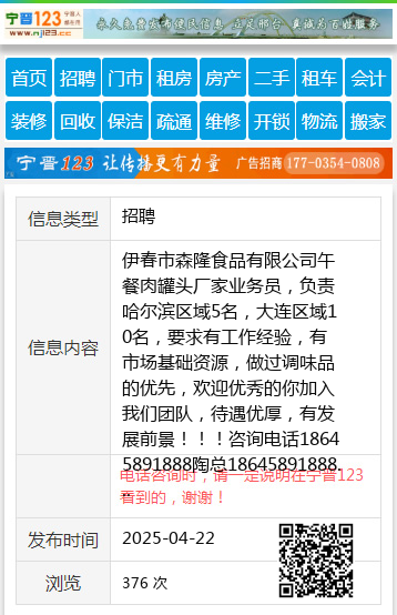 伊春市森隆食品有限公司午餐肉罐头厂家业务员,负责哈尔滨区域5名,大连区域10名,要求有工作经验,有市场基础资源,做过调味品的优先,欢迎优秀的你加入我们团队,待遇优厚,有发展前景!!!咨询电话18645891888陶总18645891888 【电话咨询时,请一定说明在伊春信息网看到的,谢谢!】 |
