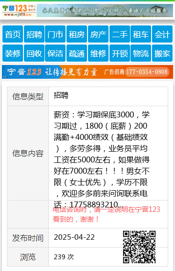 薪资:学习期保底3000,学习期过,1800(底薪)200满勤+4000绩效(基础绩效),多劳多得,业务员平均工资在5000左右,如果做得好在7000左右!!!男女不限(女士优先),学历不限,欢迎多多前来问询联系电话:17758893210田女士17758893210 【电话咨询时,请一定说明在伊春信息网看到的,谢谢!】 |
