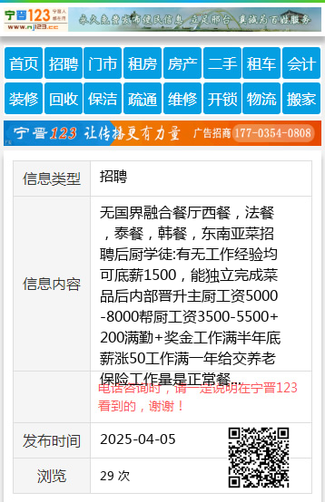 无国界融合餐厅西餐,法餐,泰餐,韩餐,东南亚菜招聘后厨学徒:有无工作经验均可底薪1500,能独立完成菜品后内部晋升主厨工资5000-8000帮厨工资3500-5500+200满勤+奖金工作满半年底薪涨50工作满一年给交养老保险工作量是正常餐饮店的三分之一工作时间10:00-21:30年龄30岁以下招聘钟点服务员若干A级工资1800底薪B级工资2000底薪C级工资2200底薪+200满勤+奖金招聘后厨杂工:要求工作麻利工资2800底薪+200满勤+绩效工作满半年底薪涨50工作满一年给交养老保险工作量是正常餐饮店的三分之工作时间10:00-21:30年龄55岁以下金女士17645597576 【电话咨询时,请一定说明在伊春信息网看到的,谢谢!】 |