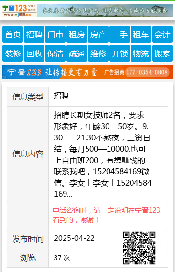 招聘长期女技师2名,要求形象好,年龄30—50岁。9.30----21.30不熬夜,工资日结,每月500—10000.也可上自由班200,有想赚钱的联系我吧,15204584169微信。李女士李女士15204584169 【电话咨询时,请一定说明在伊春信息网看到的,谢谢!】 |