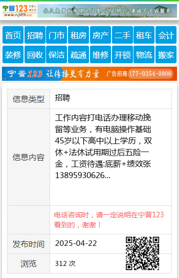 工作内容打电话办理移动挽留等业务,有电脑操作基础45岁以下高中以上学历,双休+法休试用期过后五险一金,工资待遇:底薪+绩效张13895930626 【电话咨询时,请一定说明在伊春信息网看到的,谢谢!】 |