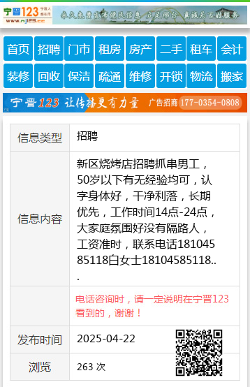 新区烧烤店招聘抓串男工,50岁以下有无经验均可,认字身体好,干净利落,长期优先,工作时间14点-24点,大家庭氛围好没有隔路人,工资准时,联系电话18104585118白女士18104585118 【电话咨询时,请一定说明在伊春信息网看到的,谢谢!】 |