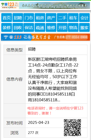 新区醉江湖烤吧招聘抓串男工14点-24点勤杂工17点-22点,男女不限,以上岗位有无经验均可,50岁以下工作认真干净就行,大家庭和谐没有隔路人希望能找到同频的同事☎️18104585118白雨18104585118