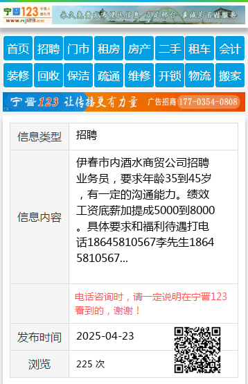 伊春市内酒水商贸公司招聘业务员,要求年龄35到45岁,有一定的沟通能力。绩效工资底薪加提成5000到8000。具体要求和福利待遇打电话18645810567李先生18645810567 【电话咨询时,请一定说明在伊春信息网看到的,谢谢!】 |