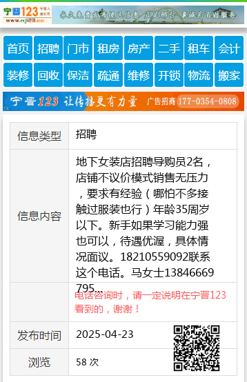 地下女装店招聘导购员2名,店铺不议价模式销售无压力,要求有经验(哪怕不多接触过服装也行)年龄35周岁以下。新手如果学习能力强也可以,待遇优渥,具体情况面议。18210559092联系这个电话。马女士13846669795 【电话咨询时,请一定说明在伊春信息网看到的,谢谢!】 |