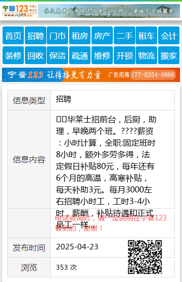 ☘️华莱士招前台,后厨,助理,早晚两个班。????薪资:小时计算,全职:固定班时8小时,额外多劳多得,法定假日补贴80元,每年还有6个月的高温,高寒补贴,每天补助3元。每月3000左右招聘小时工,工时3-4小时,薪酬,补贴待遇和正式员工一样????要求:身体健康,干活干净利索,长期稳定,有责任心,公司有岗位详细培训,2/3天就能上手,晋升空间大,????招聘电话:13384587525(微信同号)地址:世纪园华莱士汉堡店徐女士13384587525 【电话咨询时,请一定说明在伊春信息网看到的,谢谢!】 |