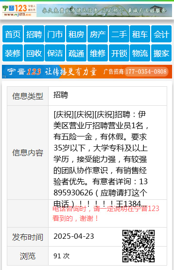 [庆祝][庆祝][庆祝]招聘:伊美区营业厅招聘营业员1名,有五险一金,有休假。要求35岁以下,大学专科及以上学历,接受能力强,有较强的团队协作意识,有销售经验者优先。有意者详询:13895930626(应聘请打这个电话)!!!!!王13846699609 【电话咨询时,请一定说明在伊春信息网看到的,谢谢!】 |