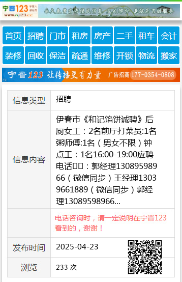 伊春市《和记馅饼诚聘》后厨女工:2名前厅打菜员:1名粥师傅:1名(男女不限)钟点工:1名16:00-19:00应聘电话☎️:郭经理13089598966(微信同步)王经理13039661889(微信同步)郭经理13089598966 【电话咨询时,请一定说明在伊春信息网看到的,谢谢!】 |