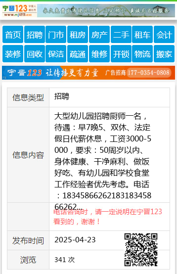 大型幼儿园招聘厨师一名,待遇:早7晚5、双休、法定假日代薪休息,工资3000-5000,要求:50周岁以内、身体健康、干净麻利、做饭好吃、有幼儿园和学校食堂工作经验者优先考虑。电话:1834586626218318345866262 【电话咨询时,请一定说明在伊春信息网看到的,谢谢!】 |