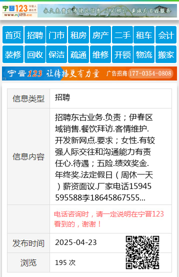 招聘东古业务.负责;伊春区域销售.餐饮拜访.客情维护.开发新网点.要求;女性.有较强人际交往和沟通能力有责任心.待遇;五险.绩效奖金.年终奖.法定假日(周休一天)薪资面议.厂家电话15945595588李18645867555 【电话咨询时,请一定说明在伊春信息网看到的,谢谢!】 |