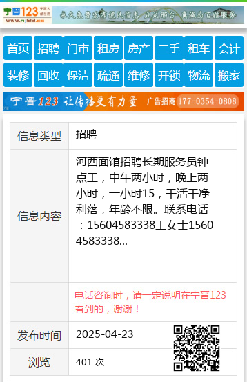 河西面馆招聘长期服务员钟点工,中午两小时,晚上两小时,一小时15,干活干净利落,年龄不限。联系电话:15604583338王女士15604583338 【电话咨询时,请一定说明在伊春信息网看到的,谢谢!】 |