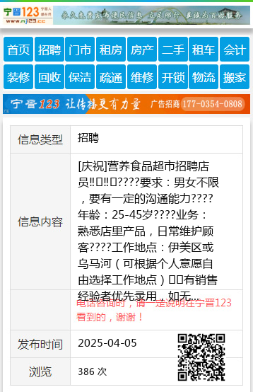 [庆祝]营养食品超市招聘店员‼️‼️????要求:男女不限,要有一定的沟通能力????年龄:25-45岁????业务:熟悉店里产品,日常维护顾客????工作地点:伊美区或乌马河(可根据个人意愿自由选择工作地点)➡️有销售经验者优先录用,如无经验公司可培训,薪资待遇面议。(需长期,短期工勿扰)☎️应聘电话:15245889990刘女士13766736677 【电话咨询时,请一定说明在伊春信息网看到的,谢谢!】 |