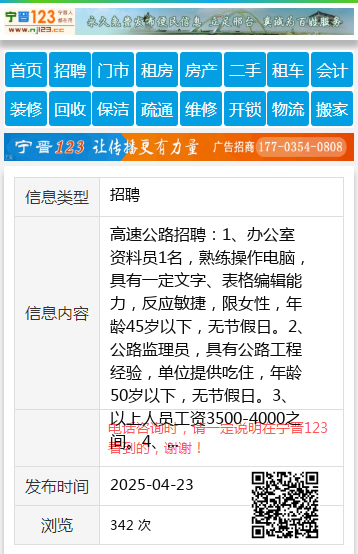 高速公路招聘:1、办公室资料员1名,熟练操作电脑,具有一定文字、表格编辑能力,反应敏捷,限女性,年龄45岁以下,无节假日。2、公路监理员,具有公路工程经验,单位提供吃住,年龄50岁以下,无节假日。3、以上人员工资3500-4000之间。4、实习生也可以。王先生15804581193 【电话咨询时,请一定说明在伊春信息网看到的,谢谢!】 |