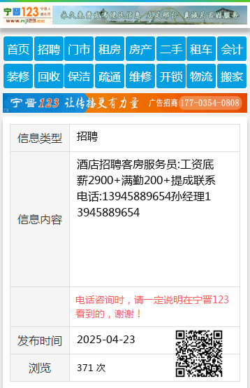 酒店招聘客房服务员:工资底薪2900+满勤200+提成联系电话:13945889654孙经理13945889654