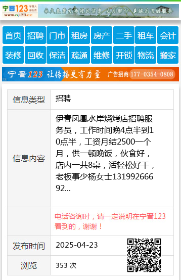 伊春凤凰水岸烧烤店招聘服务员,工作时间晚4点半到10点半,工资月结2500一个月,供一顿晚饭,伙食好,店内一共8桌,活轻松好干,老板事少杨女士13199266692 【电话咨询时,请一定说明在伊春信息网看到的,谢谢!】 |