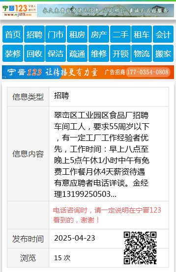 翠峦区工业园区食品厂招聘车间工人,要求55周岁以下,有一定工厂工作经验者优先,工作时间:早上八点至晚上5点午休1小时中午有免费工作餐月休4天薪资待遇有意应聘者电话详谈。金经理13199250503 【电话咨询时,请一定说明在伊春信息网看到的,谢谢!】 |