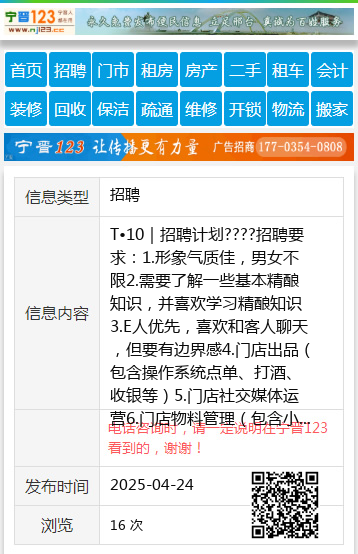 T•10|招聘计划????招聘要求:1.形象气质佳,男女不限2.需要了解一些基本精酿知识,并喜欢学习精酿知识3.E人优先,喜欢和客人聊天,但要有边界感4.门店出品(包含操作系统点单、打酒、收银等)5.门店社交媒体运营6.门店物料管理(包含小吃库存管理及啤酒库存管理)7.门店清洁(洗干净杯子尤为重要!!)8.店铺日常运营工作9.你的日常包括但不限于,和每个走进来的客人打招呼,处好关系,与客人交互,播放你喜欢且合适的歌单和电影或者动漫,根据整个环境情况推动掌控整体节奏????工作时间:15:00—24:00????工作地点:新区0458街区一楼T•10????福利待遇:1.精酿啤酒知识培训2.基础薪资3.销售提成????我们期待你:1.喜爱精酿啤酒,喜欢尝试更多酒款2.夜间生物,晚上尤其精神3.工作时间需要足够勇敢和客人交流4.喜欢记录、拍照、分享5.细致耐心,勤奋且踏实????准备材料:1.个人简历2.本人近期生活照3张????符合条件且有兴趣的小伙伴私信韩18645838855 【电话咨询时,请一定说明在伊春信息网看到的,谢谢!】 |