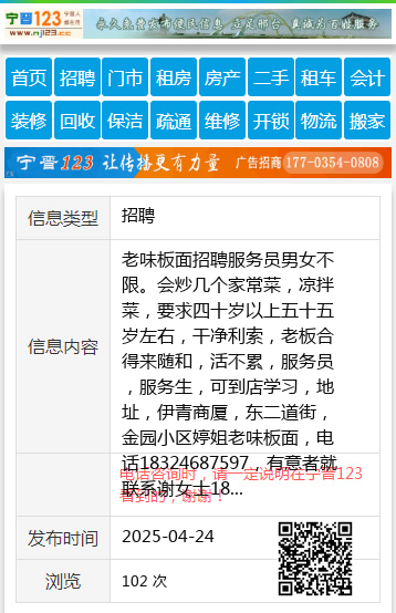 老味板面招聘服务员男女不限。会炒几个家常菜,凉拌菜,要求四十岁以上五十五岁左右,干净利索,老板合得来随和,活不累,服务员,服务生,可到店学习,地址,伊青商厦,东二道街,金园小区婷姐老味板面,电话18324687597,有意者就联系谢女士18324687597 【电话咨询时,请一定说明在伊春信息网看到的,谢谢!】 |