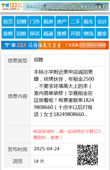 丰林小学附近美甲店诚招美睫,纹绣伙伴,年租金2500,不要求环境高大上的来(室内简单装修)毕竟租金在这放着呢!有意者联系18249808660(十点半以后打电话)女士18249808660 【电话咨询时,请一定说明在伊春信息网看到的,谢谢!】 |