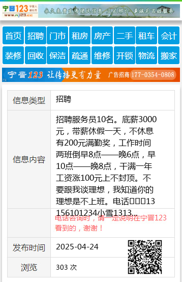 招聘服务员10名。底薪3000元,带薪休假一天,不休息有200元满勤奖,工作时间两班倒早8点——晚6点,早10点——晚8点,干满一年工资涨100元上不封顶。不要跟我谈理想,我知道你的理想是不上班。电话☎☎☎13156101234小雪13136719661 【电话咨询时,请一定说明在伊春信息网看到的,谢谢!】 |