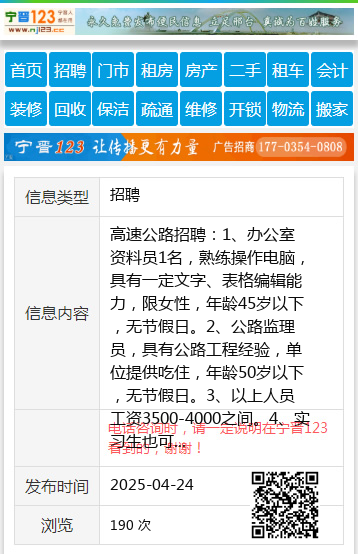 高速公路招聘:1、办公室资料员1名,熟练操作电脑,具有一定文字、表格编辑能力,限女性,年龄45岁以下,无节假日。2、公路监理员,具有公路工程经验,单位提供吃住,年龄50岁以下,无节假日。3、以上人员工资3500-4000之间。4、实习生也可以。王15804581193