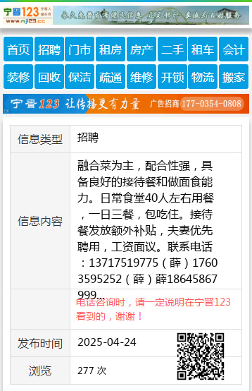 融合菜为主,配合性强,具备良好的接待餐和做面食能力。日常食堂40人左右用餐,一日三餐,包吃住。接待餐发放额外补贴,夫妻优先聘用,工资面议。联系电话:13717519775(薛)17603595252(薛)薛18645867999 【电话咨询时,请一定说明在伊春信息网看到的,谢谢!】 |