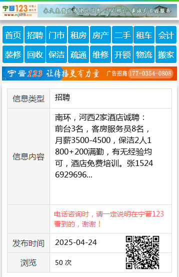 南环,河西2家酒店诚聘:前台3名,客房服务员8名,月薪3500-4500,保洁2人1800+200满勤,有无经验均可,酒店免费培训。张15246929696 【电话咨询时,请一定说明在伊春信息网看到的,谢谢!】 |