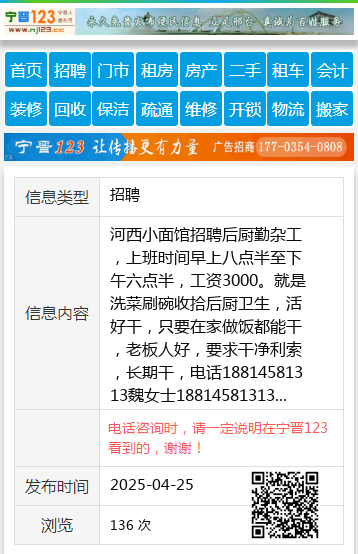 河西小面馆招聘后厨勤杂工,上班时间早上八点半至下午六点半,工资3000。就是洗菜刷碗收拾后厨卫生,活好干,只要在家做饭都能干,老板人好,要求干净利索,长期干,电话18814581313魏女士18814581313 【电话咨询时,请一定说明在伊春信息网看到的,谢谢!】 |