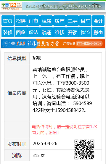 宾馆诚聘前台收银服务员,上一休一,有工作餐,晚上可以休息,工资3000-3500元,女性,有经验者优先录用,没有经验会电脑的可以培训,咨询电话:15904589422孙女士15904589422 【电话咨询时,请一定说明在伊春信息网看到的,谢谢!】 |