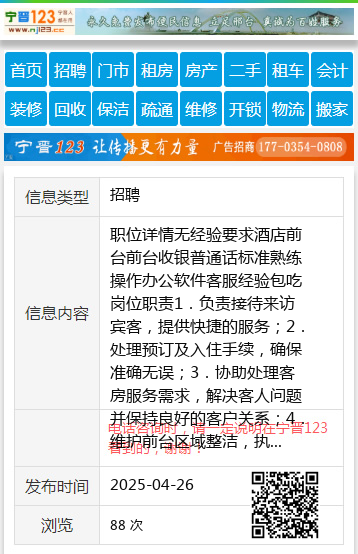 职位详情无经验要求酒店前台前台收银普通话标准熟练操作办公软件客服经验包吃岗位职责1.负责接待来访宾客,提供快捷的服务;2.处理预订及入住手续,确保准确无误;3.协助处理客房服务需求,解决客人问题并保持良好的客户关系;4.维护前台区域整洁,执行日常清洁工作。任职要求1.高中或同等学历,具备优秀的沟通技巧和服务意识;2.熟练操作电脑,有酒店前台工作经验者优先;3.工作责任心强,能适应轮班制度。4.工作时间上一天一宿休一天一宿于经理18945875538 【电话咨询时,请一定说明在伊春信息网看到的,谢谢!】 |