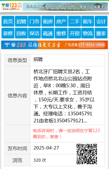 桥北牙厂招聘文员2名,工作地点桥北北山公园站点附近,早8:00晚5:30,周日休息,长期工作,工资月结,150元/天.要求女,35岁以下,大专以上文化,善于沟通。经理电话:13504579121由老板13504579121 【电话咨询时,请一定说明在伊春信息网看到的,谢谢!】 |