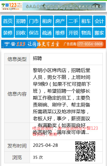 黎明小区烤肉店,招聘后堂人员,男女不限,上班时间早9晚9(如果不忙可提前下班),希望招聘一个能够长期工作稳定的员工,主要负责刷碗、刷帘子、帮主厨备所需蔬菜以及炝凉拌菜等,老板人好,事少,薪资面议,有满勤奖(如表现良好,吃苦耐劳,满年度可申请奖金)。有意者拨打电话:13644674289,咨询即可。李13644674289 【电话咨询时,请一定说明在伊春信息网看到的,谢谢!】 |